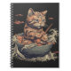 Colourful illustration of a cat eats ramen with a bowl of the wave of kanawaga.