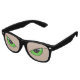 A green cat eye on each perforated flesh coloured 'lens' on black Wayfarer designer party frames.