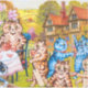 Sticker featuring Louis Wain’s animal painting Cats Relaxing in the Grounds at Napsbury (1860-1939). A smiling cat pours milk into teacups while watching six smaller cats drink milk, eat sweets, and play games in a garden. A wonderful gift for cat lovers and English art.