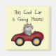 A cat in a red car and text that reads "This Cool Cat is Going Places!" on cat design t-shirts, mugs, cards, stickers, tote bags, keychains, and other iems.