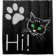 Hi text and drawings of a cats face with green eyes and a paw. Cats greetings. Shower curtain of black or dark colour, for fun and good mood.