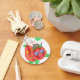 A white round keychain with the illustration of a mischievous tabby cat hiding two pumpkins and the word "Meow" written in orange letters . © ArianeC Illustrations