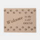 This cute doormat has a top and bottom border of dirty paw prints across a light tan background. The centre currently says Welcome to the CAT HOUSE in brown, but can be easily customised to anything you'd like.