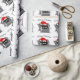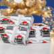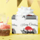 A surly looking cat who has climbed into a Christmas present box. The cat is wearing a red Santa hat. The slogan reads surprise. The slogan reads Merry Christmas. The picture is black and white except for the cats red Santa hat.