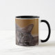 A cute grey cat lying down on the floor looking right at you in a very familiar cat pose with paws curled. The photo covers the entire mug. If you are left handed, you can customise the mug by easily reversing the photo.