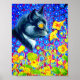 Poster featuring Louis Wain’s animal painting Cat in Sea of Flowers (1860-1939). A black and white cat with golden eyes smells yellow flowers. In the purple background are blue flowers. A wonderful gift for cat lovers and English art.