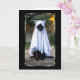 This Halloween card features an adorable black cat dressed up as a ghost, adding a playful and cute twist to the spooky season. The cat is draped in a white ghost costume that humorously still shows its pointy ears and glowing yellow eyes, giving it a charmingly eerie appearance. The background is a blurred outdoor setting, allowing the focus to remain on the costumed cat.