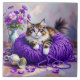 A tile with a sweet kitty cat sitting on a ball of purple yarn and next to a purple vase of flowers.
