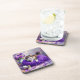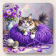 A coaster with a sweet kitty cat sitting on a ball of purple yarn and next to a purple vase of flowers.