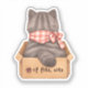 Fluffy grey cat sitting comfortably inside a cardboard box. The txt "If fits, sits" is expressing the cat's innate behavioral rule.