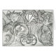Drypoint image of a cat with mountains behind it and dream images all around.