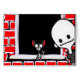 Black cartoon cat sitting on the ledge of a windowsill, holding a cartoon mouse, while a boy with a large head leans in to sneak into the picture. Snow covers the red bricks and window ledge of this cute black, white and red drawing.