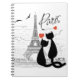 Illustration of cat love with "Paris" text design and black cats in love, red hearts, birds, Eiffel Tower and Paris scene decoration