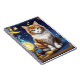 A magical frame surrounds a brown and white cat sitting on a spell book near a magic lamp with stars in the background.