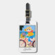 This fun luggage tag features a whimsical style illustration of a white cat riding a bicycle by the sea, with a little mouse in her basket. This design includes a personalised name on the front in stylish script lettering, and your contact details on the back.