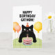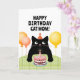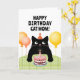 Happy Birthday cat mum card with little black cat, birthday cake and balloons.