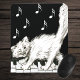 This vintage black and white image has a winking cat dancing across the keys of a piano. The background is black with white musical notes. See my store Art by MAR for matching products with this design.