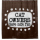 "Cat Owners Have More Fun" is a cute text design in brown with black text, along with a white accent shape and white textured whimsical dots surrounding it.