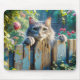 A fluffy grey cat peeks over a weathered blue fence, surrounded by lush greenery and vibrant flowers