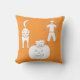Outline drawing of a cat, a kitten in a pumpkin, and a scarecrow, on a background of orange, is printed on custom pillows, for Halloween decor. The background colour can be customised. Thank you for shopping at CherylsArt on Zazzle.