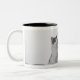 Cat sitting and licking beside pet bowl on white Two-Tone coffee mug