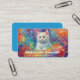 A colourful oil painting of an adorable, cute kitten sitting in a bed of flowers. This is a business card for people that cat sit.