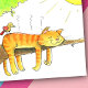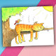 A cute orange tabby cat sleeps on a tree branch in the summer heat. A bird is sitting on its back and observing it.