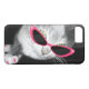 An iPhone 6 case featuring a black and white photo of a cat with pink sunglasses and claws.