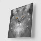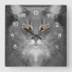 Cool cat theme wall clocks with graphic image of a cat face closeup with eyes in striking colour and the rest in black and white in what is commonly called selective colour art. Designed as a kitchen wall clock or clock for a bedroom.