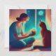 A woman sits on the floor, holding a candle in her hand, with a cat sitting across from her. Together, they share a secret, spiritual connection, as if the cat were her therapist. This whimsical and humourous fantasy art piece, created by Lumirala and Magic Media AI, captures the unique bond between the woman and her feline friend. Available in various sizes, this flat card is perfect for adding a touch of enchantment and humour to your message.It’s an ideal card for cat lovers, art enthusiasts, and anyone who appreciates the mystical and magical aspects of life.