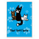 A customizable greetings card template featuring three cartoon cats. One tabby, one black and one white on a vibrant blue background with lighter blue pawprints.