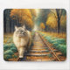 A fluffy cat with green eyes walks confidently on a railway track surrounded by a vibrant autumn forest with trees showcasing golden and orange leaves