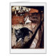 A cat is walking on the railing of a mediaeval building. Artwork by Arthur Rackham.