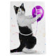 Black and white tuxedo cat with purple balloon and confetti on white background for 30th birthday.