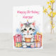 Cute birthday card for girls. Cute for a child or adult. A white and grey kitty cat holding a birthday cupcake surrounded by gifts. You can customise the card by adding a name in the personalise area. Cute puppy and birthday pun inside along with a colouring page. Cute pink, purple, green and blue.