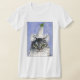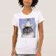 An adorable silver and white kitty wearing a trumpet-shaped flower hat. Cute! Also available as a note card, postage stamp and mens'/kids' tee shirts.