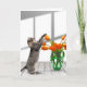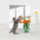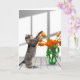 Grey tabby cat playing with orange tulip bouquet and shadow background for general birthday