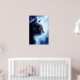 The image features a close-up portrait of a black cat with piercing red eyes. The cat's fur is rendered in a soft, almost ethereal style, with a slight blue hue. The background is a blurred, abstract design of blue and white, creating a sense of mystery and intrigue. The cat's gaze is directed towards the right, its whiskers prominent and its expression alert and watchful. Perfect gift for cat lovers.