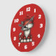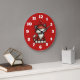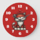 A clock with a whimsical drawing featuring a big orange red kitty cat.