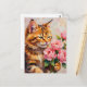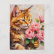 The illustration depicts a fluffy, orange and black tabby cat with green eyes, positioned next to a bouquet of pink roses. The cat is looking slightly to the right, with a serene expression. The roses are in full bloom, with green leaves visible. The background is a soft blend of pink and beige, creating a gentle and warm atmosphere.