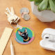 A close-up of a cat wearing a collar, framed within a circular mirror against a colourful background, showcasing its bright eyes and unique features.