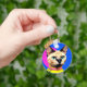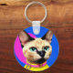 A close-up of a cat wearing a collar, framed within a circular mirror against a colourful background, showcasing its bright eyes and unique features.