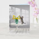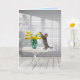Name Day yellow tulip bouquet on old wooden table and playful gray tabby cat.