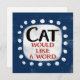 An irreverent and cute typographic animal design that says "Cat Would Like A Word". It features black and red text on a white rectangle with funky, playful white dots surrounding it, all on a blue background.