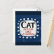 An irreverent and cute typographic animal design that says "Cat Would Like A Word". It features black and red text on a white rectangle with funky, playful white dots surrounding it, all on a blue background.