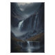 An epic and breathtaking landscape where a mighty waterfall plunges through dark, moss-covered rock walls. The dense mist and soft light create a mysterious and dramatic atmosphere, evoking the raw power of nature and a sense of ancestral grandeur. A feeling of peace and admiration mixes with the imposing power of the waterfall.