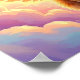 This fantasy poster features an orange tabby cat angel wearing a gold halo, sitting down on a soft dreamy cluster of clouds with a beautiful rainbow and the radiant sun. Finished as an oil paint print.