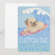 A cute illustration of a pug surfing on a pink surf board with texts "CATCH THE WAVE"