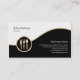 This caterer business card features black and white segments separated by a wavy gold strip. An elegant gold icon of a cutlery lies on the lower left side of the design, that's generally suitable for catering, food, restaurant, cafe, deli, eateries, meals, cooking, catering themes.