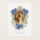 Featuring a beautiful traditional Catholic image of the image of the betrothal of Mary and Joseph with a decorative gold border accented blue flowers. A prayer is on the back for the bride and groom. All text and fonts can be modified.